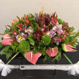 Price: $400.00White Cross with Red Roses Spray Wreath